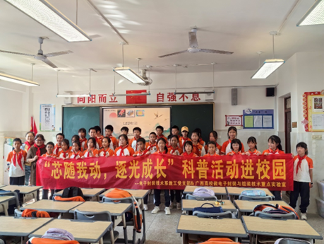 2024年11月8日,广西高校微电子封装与组装技术重点实验室携手电子封装技术系教工党支部,走进东昇小学,开展“芯随我动,逐光成长”科普活动。