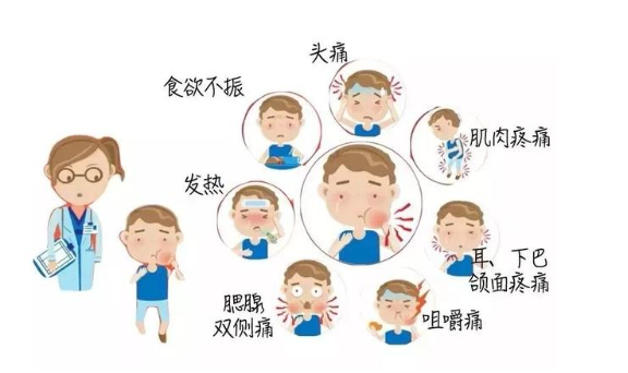 本病潜伏期约14-21天,大多数起病较急,有发热、畏寒、头痛、咽痛等全身不适症状。患者先觉一侧耳下腮腺肿大、疼痛,咀嚼时更痛。2-3天后,另一侧腮腺也肿痛,肿块以耳垂为中心,边缘界限不清。表面发热,手压时有弹性感和压痛。4-5天逐渐消退。少数病人有时可有颌下腺和舌下腺肿胀疼痛。