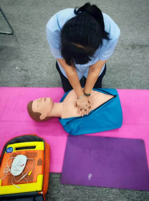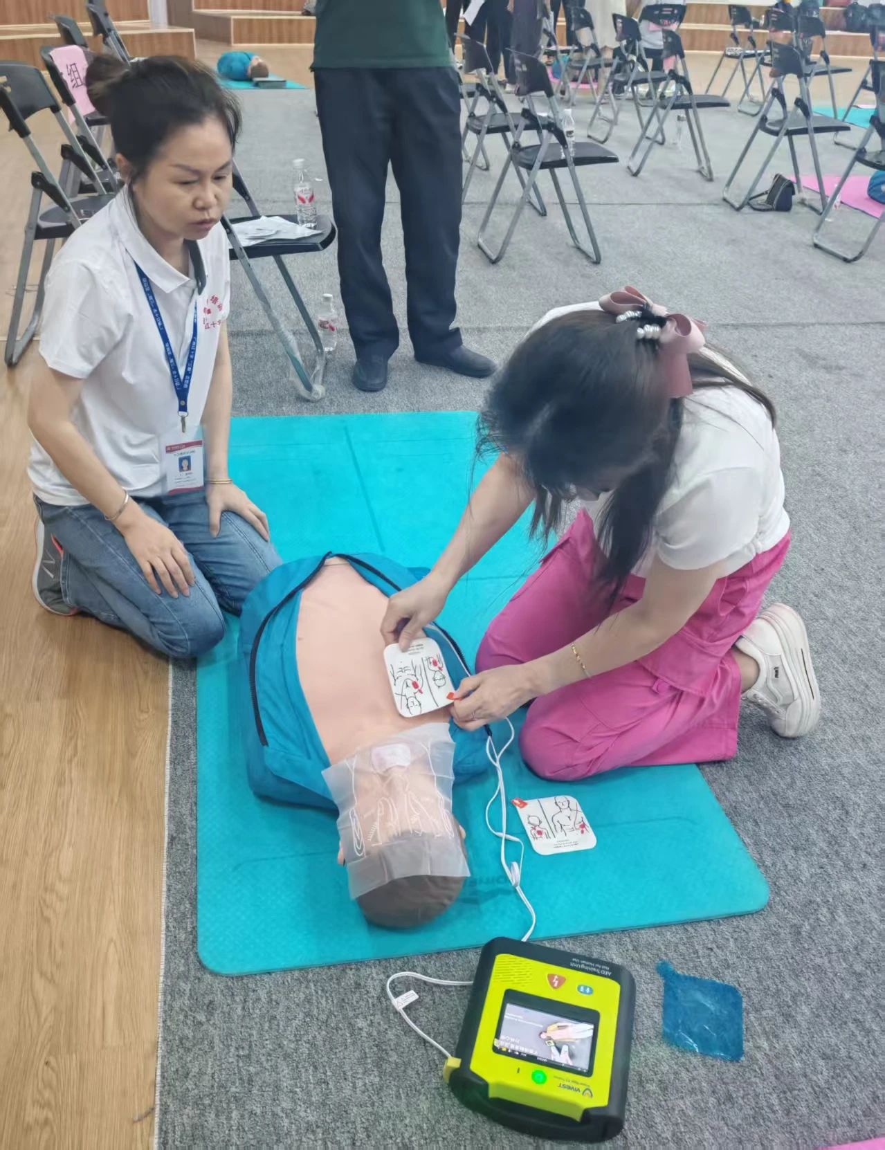 精准理论教学:红十字会专家范然直主任通过图文课件与真实案例,深入浅出地讲解了“黄金4分钟”的急救原理,系统演示了CPR标准操作流程(判断意识呼吸、胸外按压、人工呼吸) 和 AED“开机-贴片-除颤”三步操作法,为实操打下坚实基础。