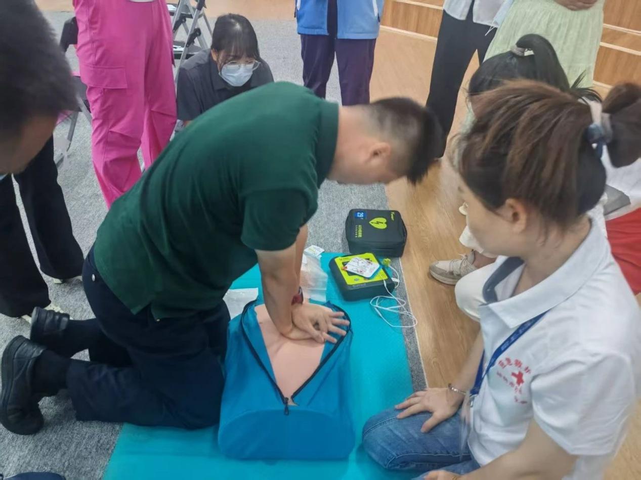 全员实战演练:参训教职工分组进行高强度实操训练。在专业讲师“一对一”指导下,大家反复练习胸外按压的深度、频率,人工呼吸的技巧,以及AED电极片的精准粘贴。每一个动作细节都经过严格把关,确保技能规范到位。