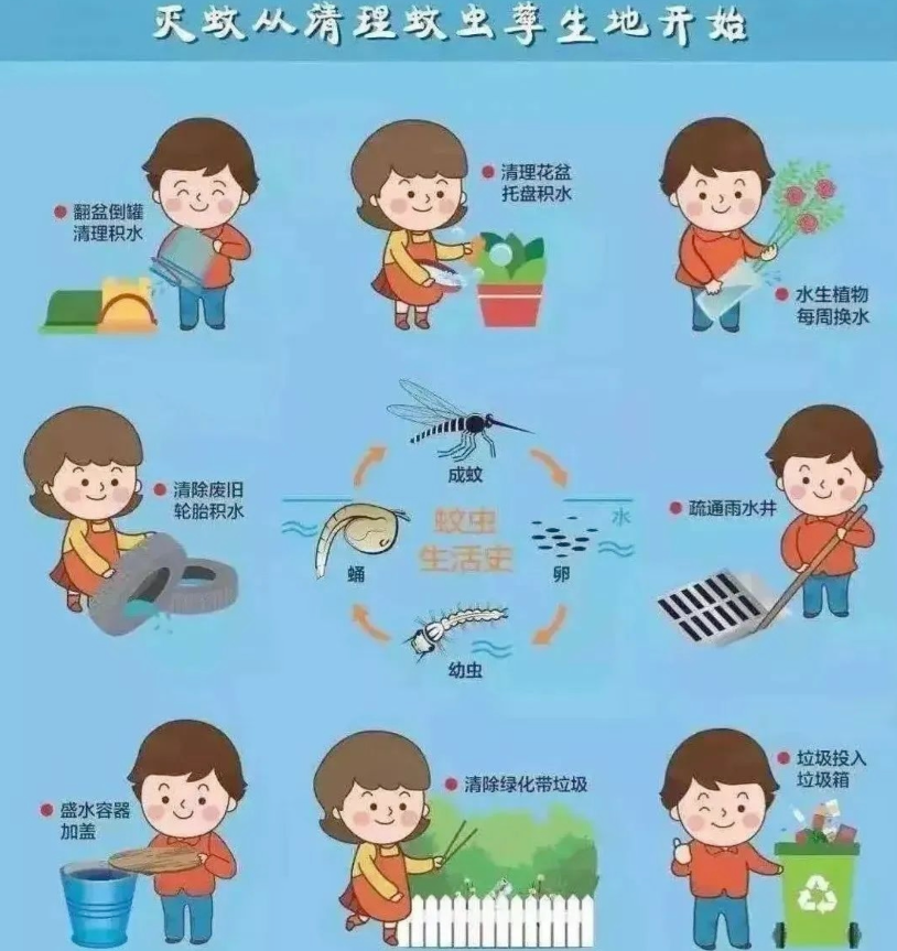 1.清积水:积水蚊子的育婴室翻盆倒罐,清除室内外小型积水容器(花瓶、托盘、废旧轮胎、闲置容器等),是最根本的措施!