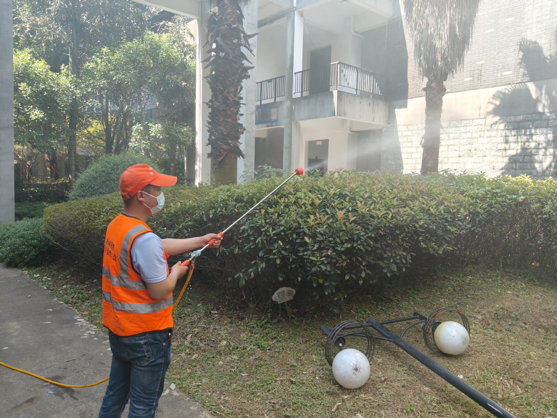 后勤处迅速行动,从源头清除隐患。组织绿化团队全面修剪校园草坪,实施科学灭蚊,清理低洼地段、楼顶天面、花盆托盘、水池等区域的积水,并疏通排水沟;安排专人每日对蚊虫孳生地进行药物滞留喷洒,有效降低蚊虫密度。此外,聘请专业消杀公司对教室、宿舍、图书馆、办公楼、绿化带、下水道、运动场等区域开展全覆盖、无死角消杀作业。整个过程严格遵循操作规程,确保药剂使用安全、高效。