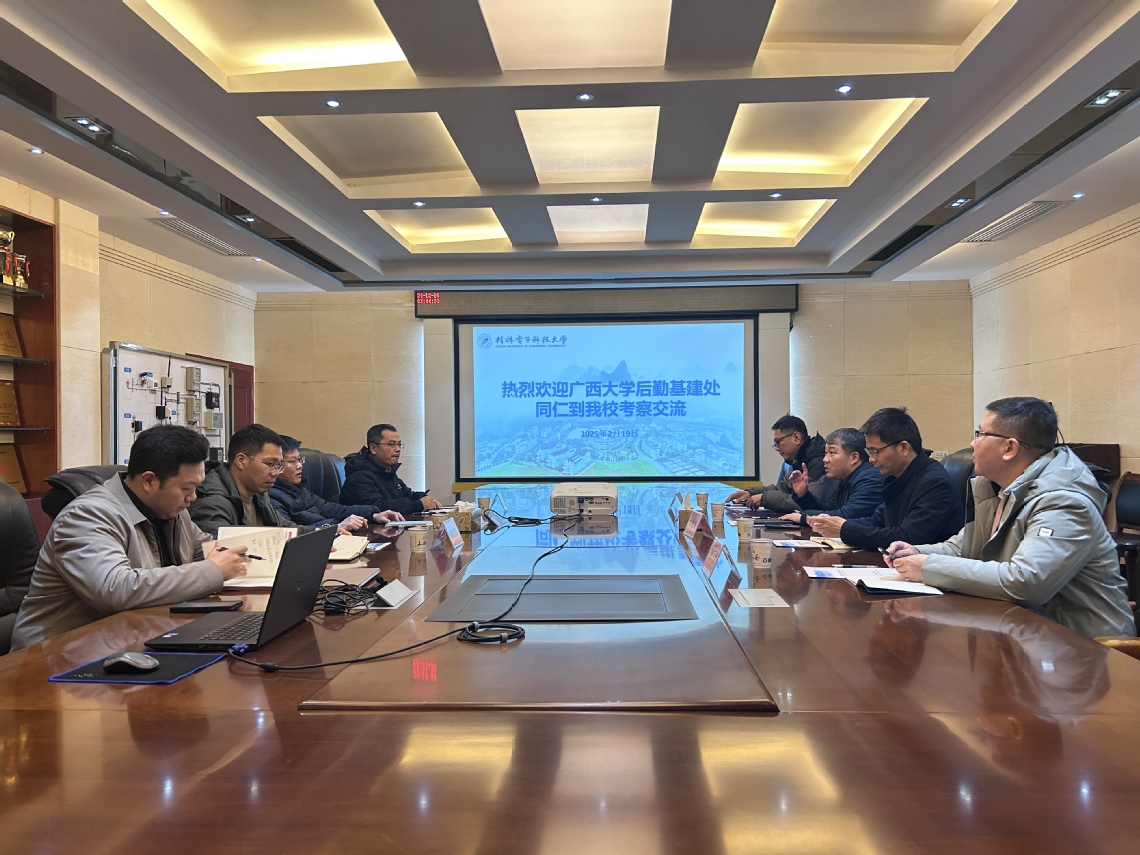 2月19日下午,广西大学后勤基建处党委书记黄必春一行到三亿官方官网三亿(中国)_三亿(中国)后勤处调研交流,三亿官方官网三亿(中国)_三亿(中国)后勤处处长陈文武热情接待并与来访客人进行了座谈,后勤处副处长孙希刚、水电科和节水服务公司相关人员参加了座谈会。