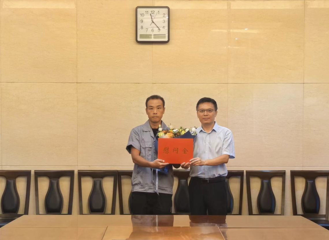 陈松青副校长与廖吉庆进行了亲切交谈,详细了解他的工作生活情况,对他的辛勤工作和默默奉献给予充分肯定,并勉励他立足岗位,再接再厉,在岗位上做出新贡献。陈松青副校长指出,后勤服务保障部门在学校运行中作用非常重要,大家兢兢业业,默默奉献,特别能吃苦,特别能战斗,特别是假期中,大家没有休息,保质保量完成各项小型工程维修、校园美化以及物业保洁和食堂运营任务。他希望后勤干部继续发扬优良工作作风,担当实干,勇于创新,在服务师生、保障学校高质量发展工作中做出新业绩。随后,陈松青副校长向廖吉庆送上了节日的祝福和慰问金。