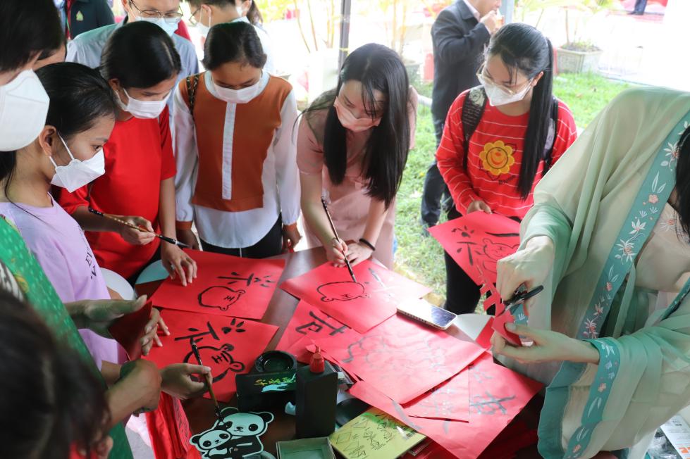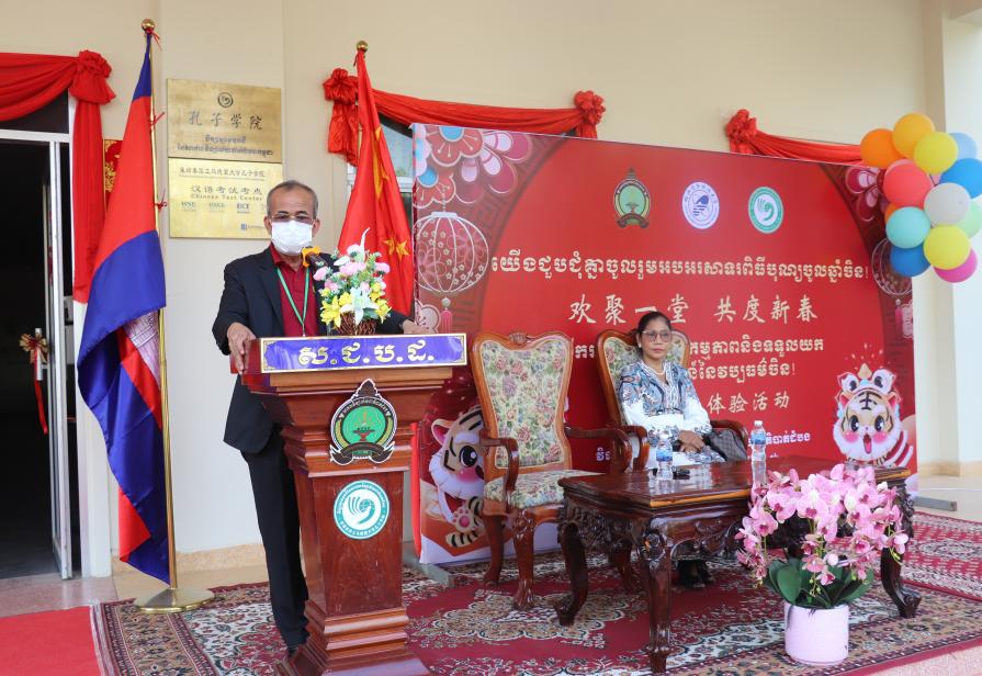 活动开始前,国立马德望大学校长索坤阁下发表致辞,他回顾了过去一年来孔院对国立马德望大学以及中柬文化交流所做出的贡献,对孔院全体员工的努力表示肯定和感谢,并将继续支持孔院发展壮大,祝愿大家新春快乐。中方院长易永忠教授首先感谢了社会各界对孔子学院的支持,并介绍了孔院一年来取得的成就,最后表示希望大家在体验活动中感受中国春节魅力,祝愿大家新的一年虎虎生威。柬方院长山姆莱尼在致辞中介绍了中国春节的历史,并表示2022年是中国农历中的虎年,祝贺大家虎年大吉。