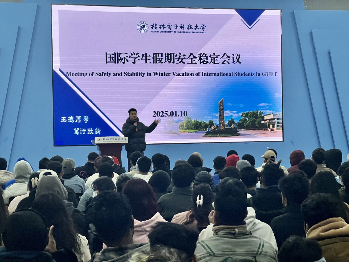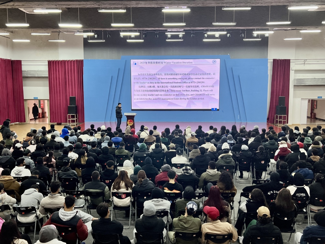 2025年1月10日下午,我院成功举行全体国际学生假期安全教育大会,留学生管理工作办公室主任吴任朝为全体留学生上了一堂生动的安全教育课,他强调,各位留学生在享受中国春节假期的同时应自觉遵守各项中国法律法规及学校校纪校规,注意保护个人人身及财产安全等假期安全事项。会后,吴任朝主任带领全体留学生辅导员走访留学生公寓,开展寒假前宿舍区域安全隐患排查,并于1月11日对全体外宿留学生进行了家访,强调假期外宿安全注意事项,并传递学校的关心关怀与慰问。