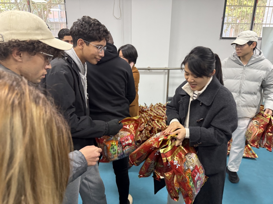 院长高兰英、副院长邓妍祯对寒假留校的国际学生表达了新春祝愿,并寄语同学们珍惜在华学习的宝贵时光,继续秉持积极进取的态度,在新的一年里再创佳绩。为表达对留校学生的深切关怀,学院精心准备了包含春联、福字和美味小吃的节日大礼包,将中国文化的温情融入礼物之中送到每一位留校学生的手中,让国际学生感受到“异乡亦有家”的温暖。