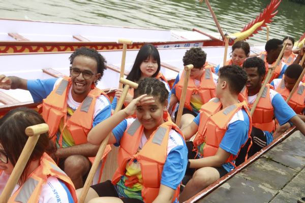 本次比赛以文化展示为主,留学生龙舟队身着统一队服,赢得现场观众的阵阵喝彩。赛事期间,同学们不仅体验了龙舟竞渡,还参与了唱山歌活动。