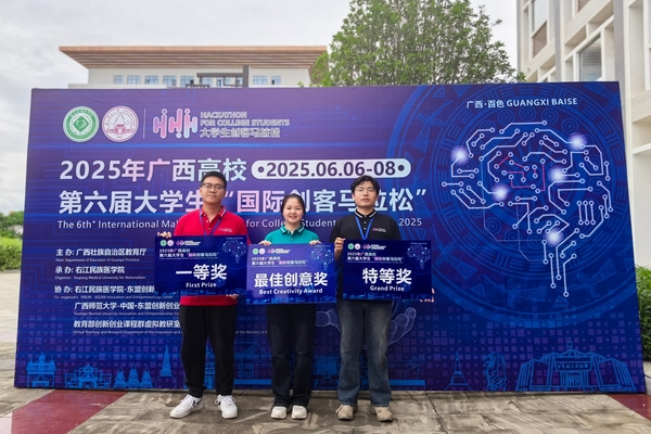 6月6日至8日,2025年全区高校第六届大学生“国际创客马拉松”活动举行。经过激烈角逐,信息与通信学院本科生于越康、我院留学生研究生MAI TU DUY(中文名:梅岫维)在比赛中脱颖而出,荣获特等奖1项、一等奖1项、最佳创意奖1项。