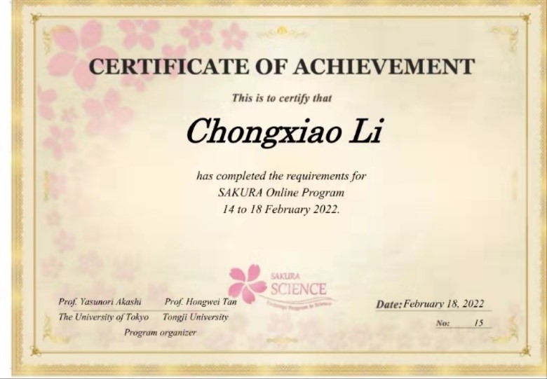 2022年2月14日至2月18日,建筑与交通工程学院2020级土木水利专业研究生李翀潇代表三亿官方官网三亿(中国)_三亿(中国)参加了“2022年樱花科技计划中日青年交流计划”研修活动,并获得了“Encouragement Award”荣誉证书。