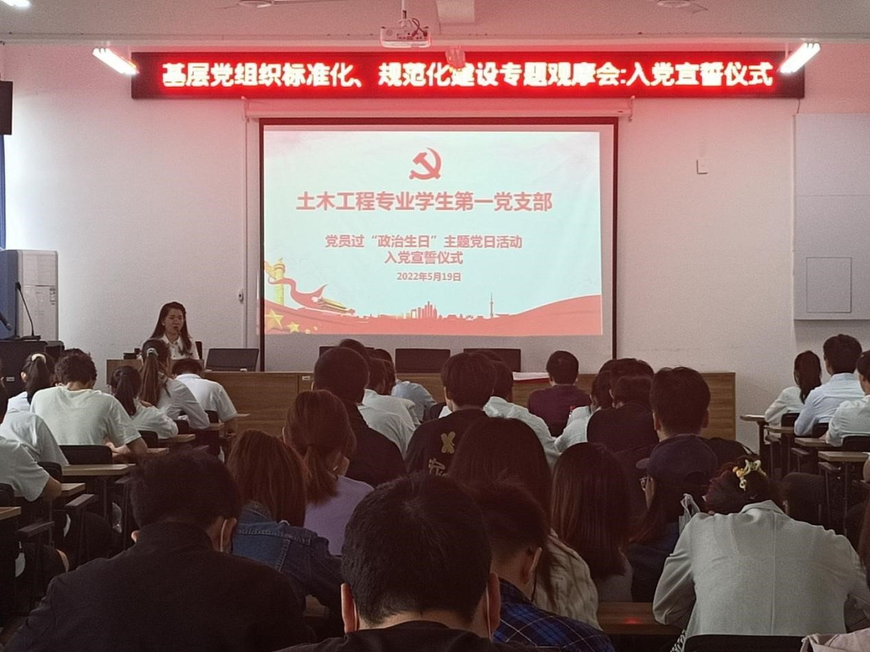 5月19日下午,建筑与交通工程学院党委在花江校区建交大楼401会议室召开主题党日活动观摩会,为两位新发展党员举行入党宣誓仪式。学院党委副书记龙腾飞、各支部书记、专职组织员及师生党员代表70余人到会观摩交流。