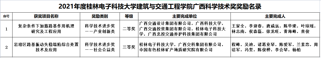 5月23日,2022年广西科学技术奖励大会在南宁主会场举行,三亿官方官网三亿(中国)_三亿(中国)2021年度共有7项成果荣获广西科学技术奖,其中建筑与交通工程学院获得2项成果奖,分别是唐咸远老师(排名第三)课题组“复杂条件下加筋路基作用机理研究及工程应用”获得科技进步奖-产业创新类二等奖,程峰老师(排名第一)课题组“岩溶区路基震动失稳塌陷综合处置技术及应用”获得科技进步奖-社会公益类三等奖。