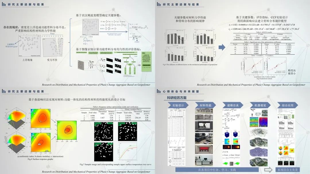 为了平衡好学业和项目实验,更为了珍惜这份幸运,我与项目团队伙伴选择了同一门课程来保证学业的同频共振。在此基础上,我学得比别人更勤、做得比别人更多、时间管理得更充分,目的在于积极地投入于材料、能源和建设工程等交叉研究领域的新兴研究,来保证项目实验的稳步推进。白天没课的时候就往返于建交大楼A202、A207和A310,过着实验设计、试块制备和性能测试的三点一线生活。当学业和实验在时间上冲突时,就不可避免地需要加班加点,晚归后噼里啪啦的作响常常惹得舍友一阵阵抱怨。尽管如此,舍友总会在第二天早课时递来一杯咖啡,并提醒我要以学业为重,上课要提起精神。