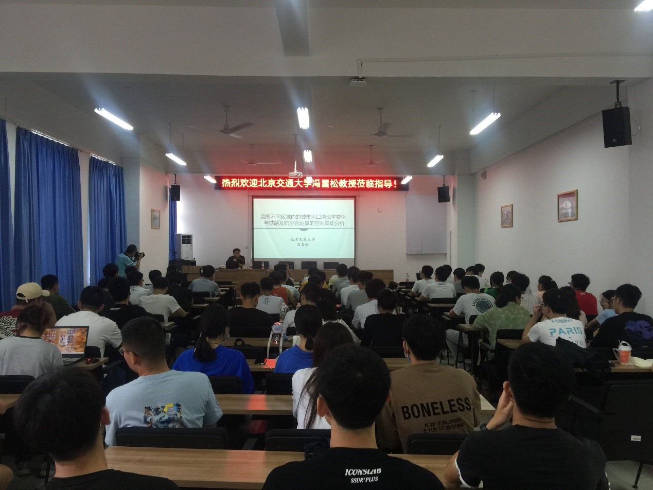 冯雪松教授以“我国不同区域内的城市人口增长率变化与铁路及航空客运量的空间联动分析”为题,从空间自回归模型(Spatial Autoregressive,SAR)的基础理论出发,详细介绍了模型的建立和标定问题。冯教授以中国6大地理区域位置的15个典型城市为例,着重介绍了该模型在实际中的应用,并对计算结果暗含的深层次意义进行了剖析。冯教授还亲切地回答了同学们提出的各类问题,勉励大家认真钻研,在理论和应用方面取得更多创新性成果。