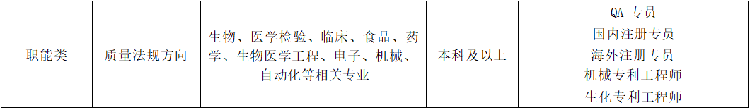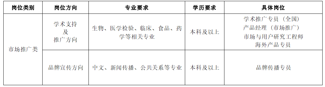 试剂研发类 | 医学方向 | 临床医学、基础医学、检验医学、 生物学等相关专业 | 硕士及以上 | 医学与科学事务经理 临床应用工程师 |