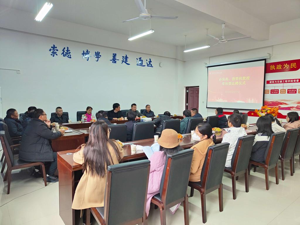 2月17日上午,建筑与交通工程学院在建交大楼412会议室举行退休教职工教职工荣退休暨返聘仪式活动。学院全体领导班子、退休教师孙保燕、唐碧秋,以及教职工代表、学生代表等参加了活动。