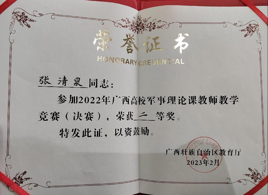 2023年2月28日至3月1日,广西高校军事理论课教师教学竞赛(决赛)在桂林旅游学院金桂厅举办,我院张清泉老师讲授的《中华利剑——中国武装力量》荣获二等奖。