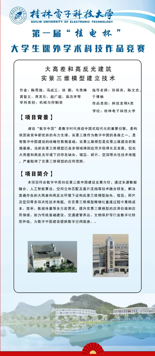 陈思瀚团队所设计的“大高差和高反光环境实景三维模型建立技术研发及应用”项目荣获广西区赛一等奖。