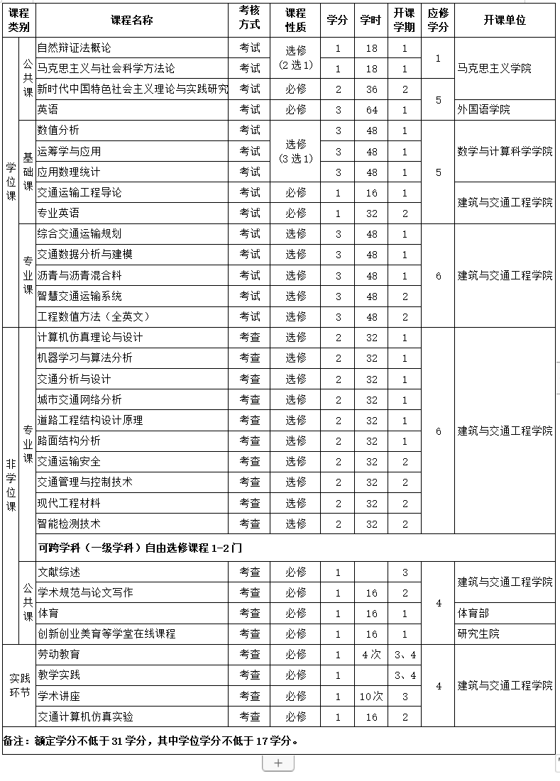攻读本专业硕士研究生需获得学位课学分不少于17学分,总学分不少于31学分。详见附表1《交通运输工程学术学位硕士研究生课程设置及学分要求》和附表2《交通运输工程学术学位硕士研究生实践环节基本要求及考核办法》。