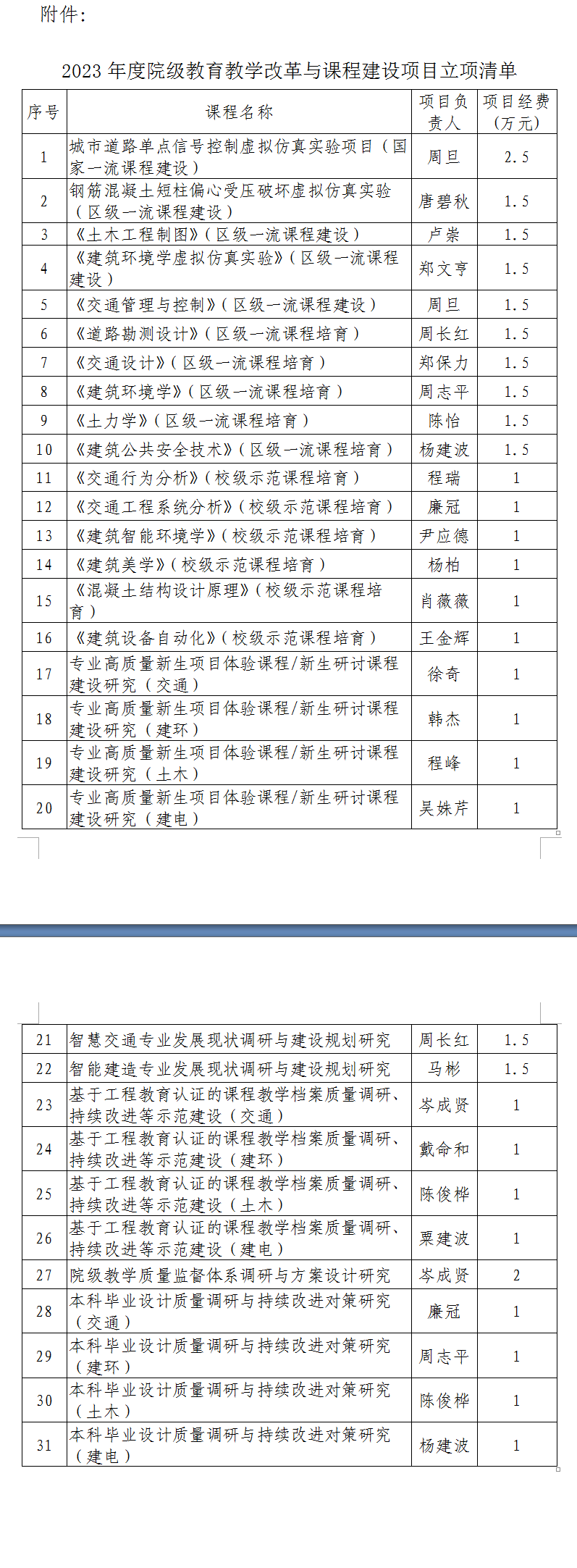 关于2023年度建筑与交通工程学院院级教育教学改革与课程建设项目立项的通知