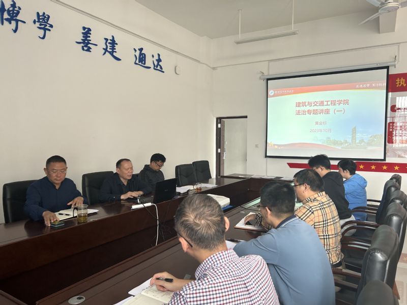 10月13日,建筑与交通工程学院于建交大楼412室召开法治专题讲座,讲座由学院党委书记黄金标主讲,学院党委委员、系主任、辅导员、组织员参加。
