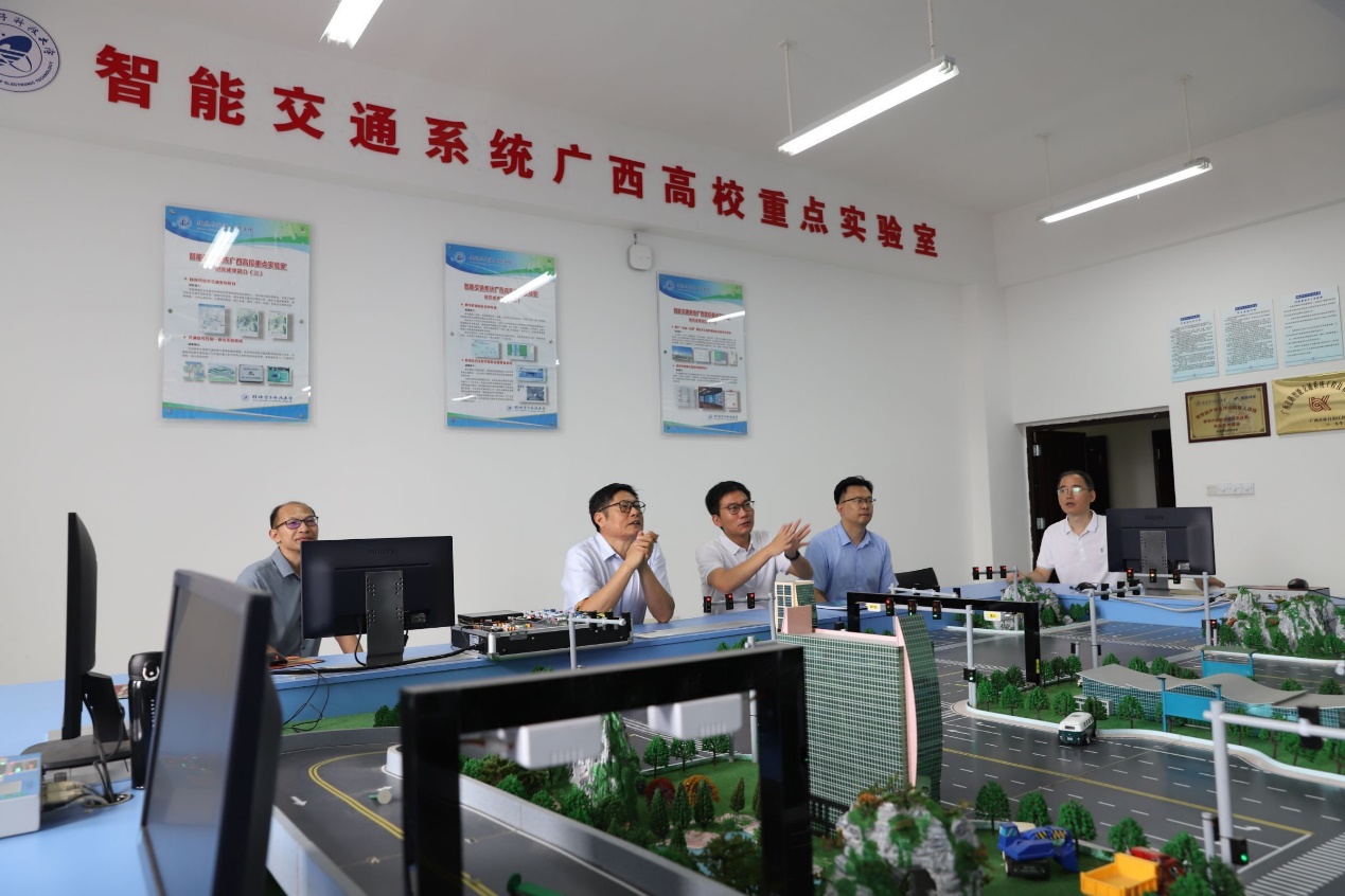 唐伯明教授首先参观了学院广西智慧交通重点实验室、智能建造实验中心以及自动驾驶车联网实验平台等学科平台与实践教学资源,然后在建交楼412会议室听取了王涛院长的介绍。唐伯明教授对我院近年来的快速发展表示高度肯定。同时,他还为学院的未来发展提出了许多宝贵意见,他认为学院的专业与学科发展应进一步融合电子信息特色,加快推进交通、土木与学校优势学科的全方位交叉与建设;唐伯明教授还认为,学院在学科发展、资源建设等方面具有良好的基础,应继续以国家与广西的重大交通发展战略为引领,加强与地方政府、企业的高效对接,共同推动桂电交通运输及土木学科的高质量发展。