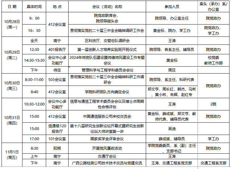 2024年秋季学期第8周建筑与交通工程学院重要会议(活动)安排