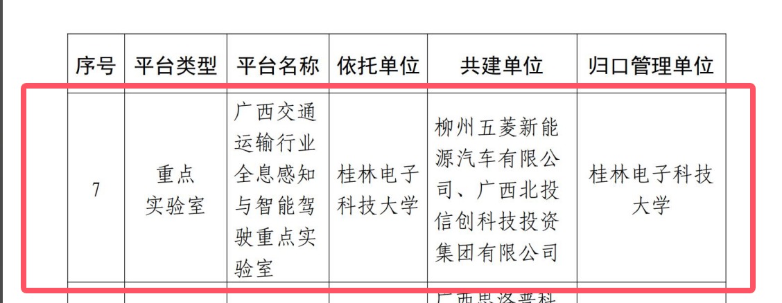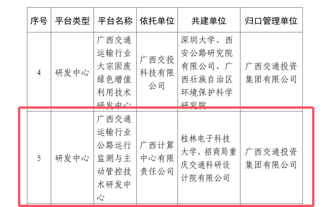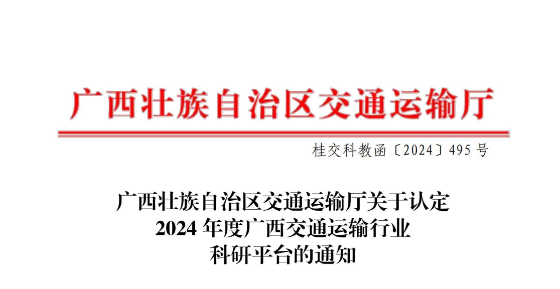 近日,自治区交通厅公布了2024年度广西交通运输行业科研平台的认定名单(桂交科教函〔2024〕495号),全区新认定 12个科研平台为广西交通运输行业科研平台。我院牵头申报的“ 广西交通运输行业全息感知与智能驾驶重点实验室”和与广西计算中心有限责任公司、招商局重庆交通科研设计院有限公司共建的“广西交通运输行业公路运行监测与主动管控技术研发中心”2家科研平台列入认定名单,这是我院首次获得广西交通厅重点实验室,也是我院首次同时获得2个交通厅科研平台。
