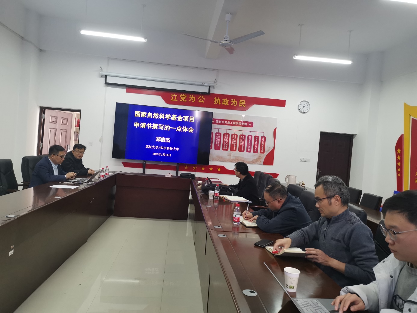 应广西智慧交通重点实验室、建筑与交通工程学院邀请,武汉大学郑俊杰教授于01月14日下午15:00-17:30在学院A412会议室作“国家自然科学基金项目申请书撰写的一点体会”的报告,学院有关教师参加了报告会,报告会由副院长吴迪主持。