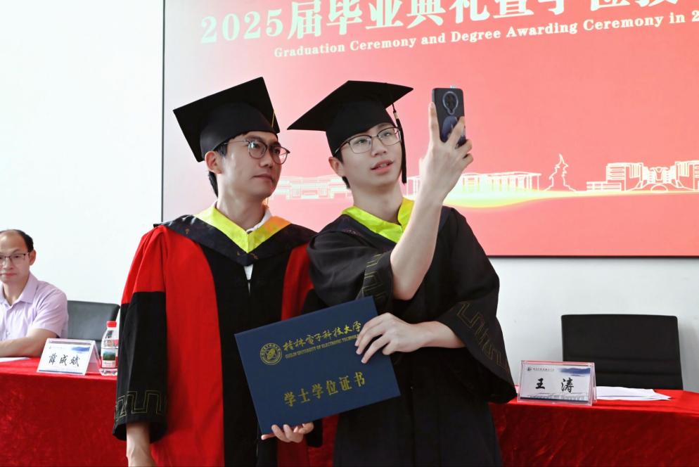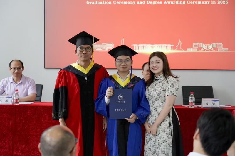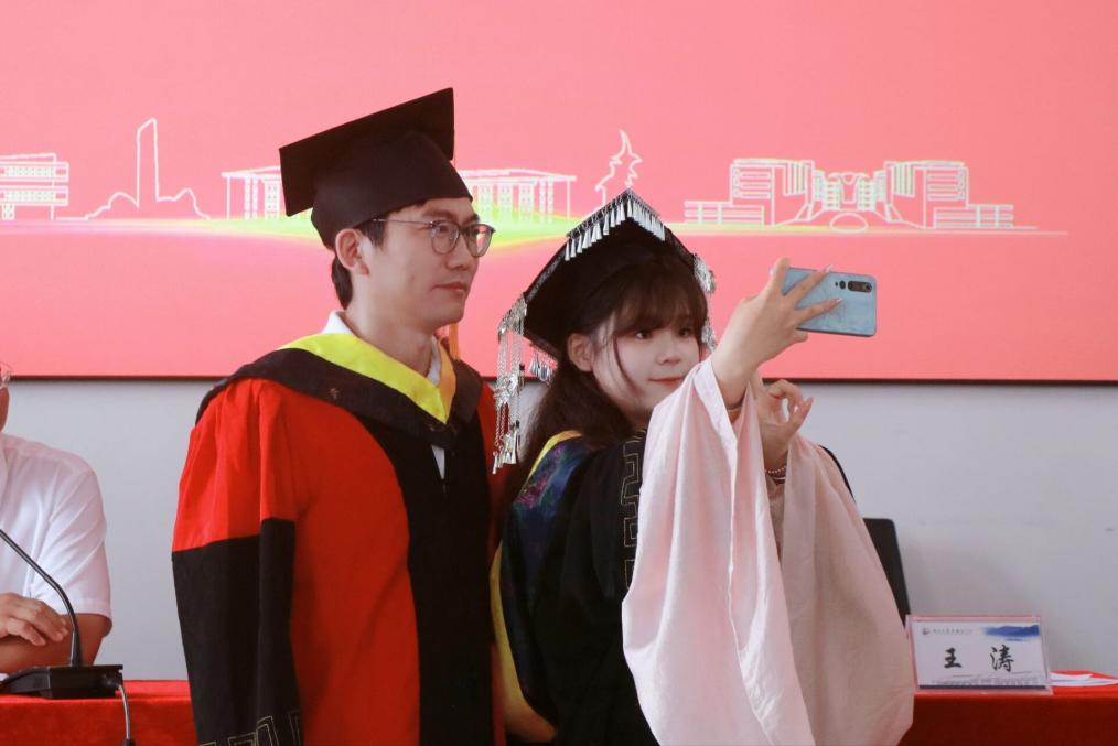 学院学位授予仪式上,学院院长王涛为我院2025届毕业生代表拨穗授予学位。在这充满喜悦与感激的时刻,同学们怀着激动的心情与院长合影留念,用镜头定格下人生中最真挚、最宝贵的一刻。