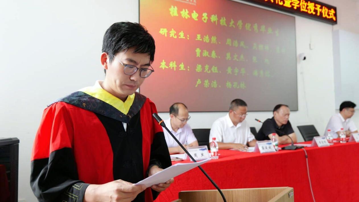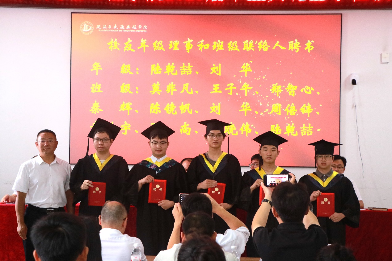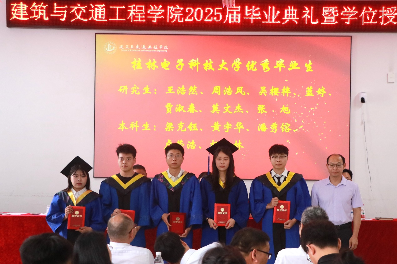 学院院长王涛宣读2025届广西区优秀毕业生、校优秀毕业生、校优秀毕业生干部、校优秀毕业设计、校友年级理事和班级联络人名单。学院领导为2025届“广西区优秀毕业生”“校优秀毕业生”“校优秀毕业生干部”“校优秀毕业设计”颁发荣誉证书,为“校友年级理事和班级联络人代表”颁发聘书。
