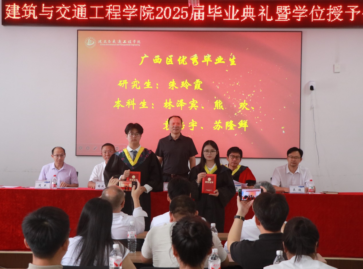 学院院长王涛宣读2025届广西区优秀毕业生、校优秀毕业生、校优秀毕业生干部、校优秀毕业设计、校友年级理事和班级联络人名单。学院领导为2025届“广西区优秀毕业生”“校优秀毕业生”“校优秀毕业生干部”“校优秀毕业设计”颁发荣誉证书,为“校友年级理事和班级联络人代表”颁发聘书。
