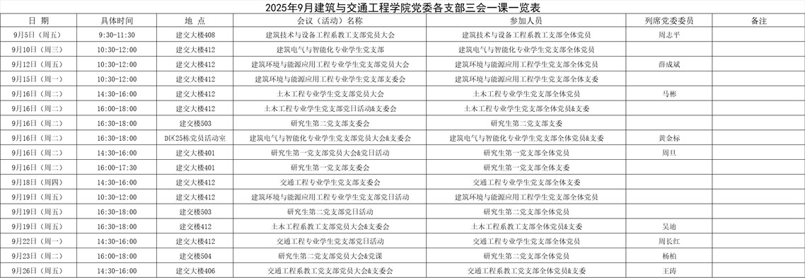 2025年9月建筑与交通工程学院党委各支部三会一课一览表