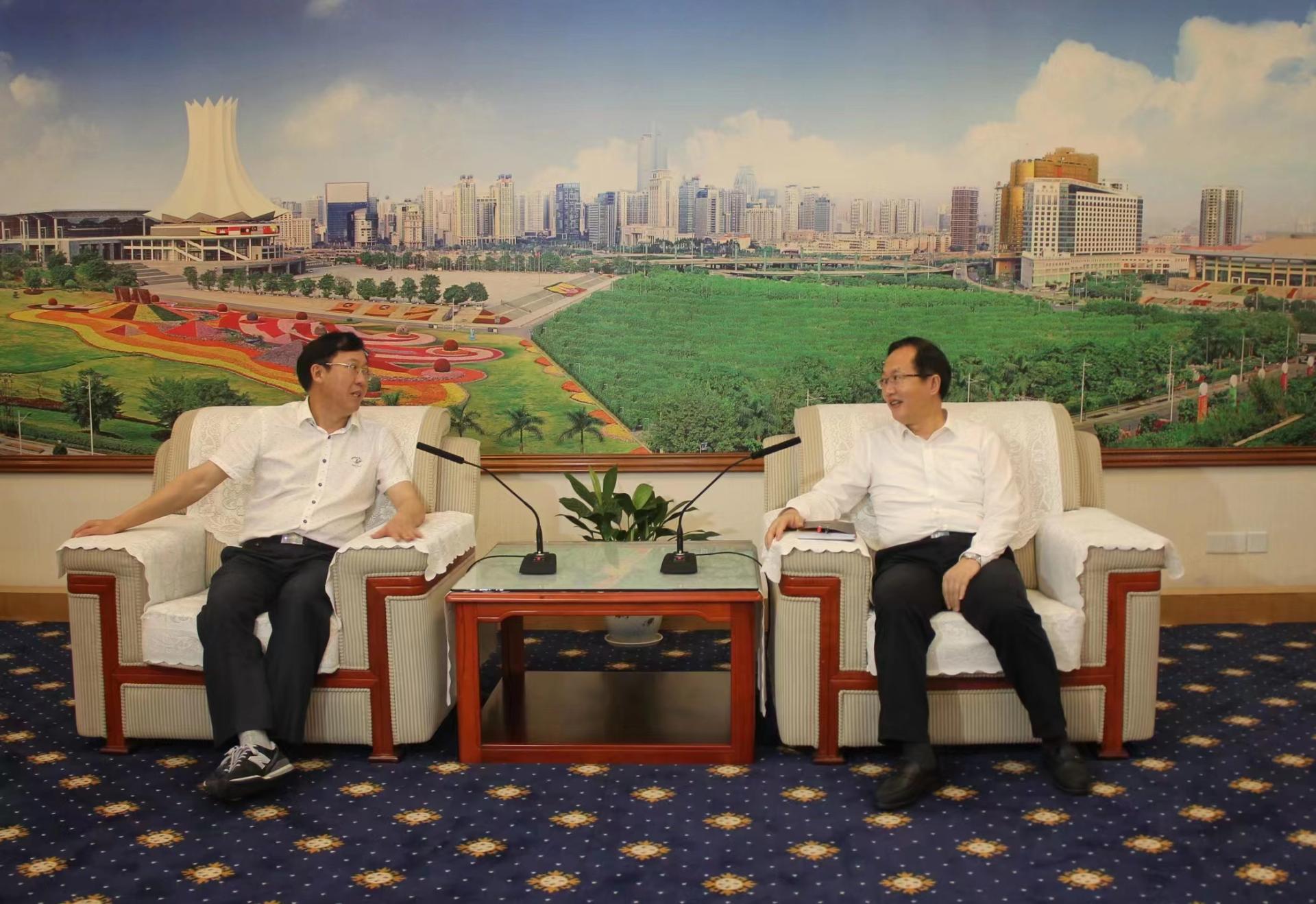 校党委书记唐平秋(左)与南宁市市长廖立勇(右)进行交流