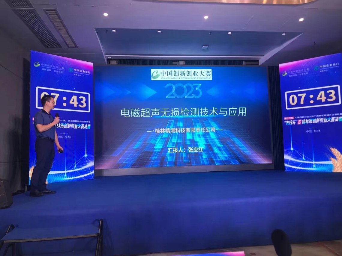桂林精测科技有限责任公司负责人张应红在比赛现场向专家评审团全方位介绍企业核心技术