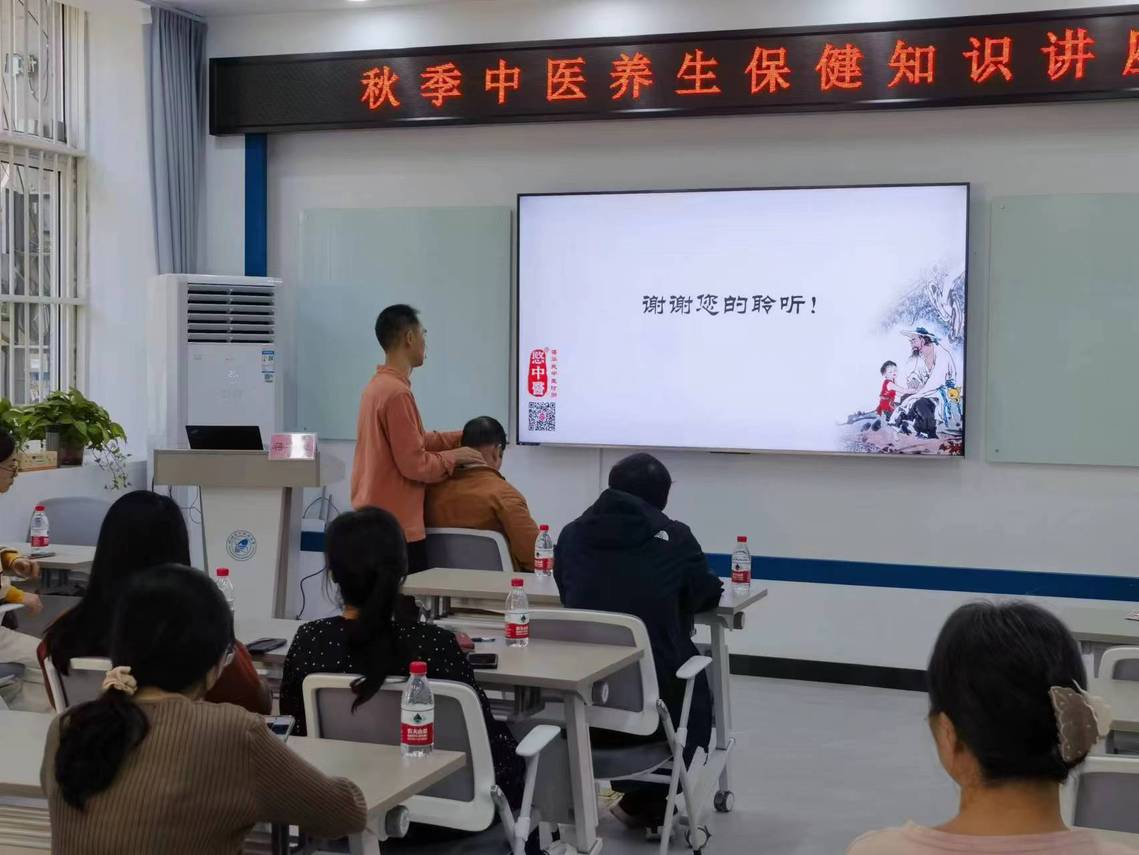 本次活动特邀蒋华民副主任医师,围绕中医养生理念、食疗养生、精神、运动、起居、常用养生保健方法等多个方面进行了细心讲解和指导,给大家普及克服秋燥、防病保健的知识。蒋华民医师还向大家推荐了一些秋冬季的药膳食疗和一些药方等,教大家几个养生穴位按揉方法。讲座结束后,蒋华民医师又为现场参会人员进行了把脉、健康咨询等义诊服务,耐心的解答大家的疑问 。