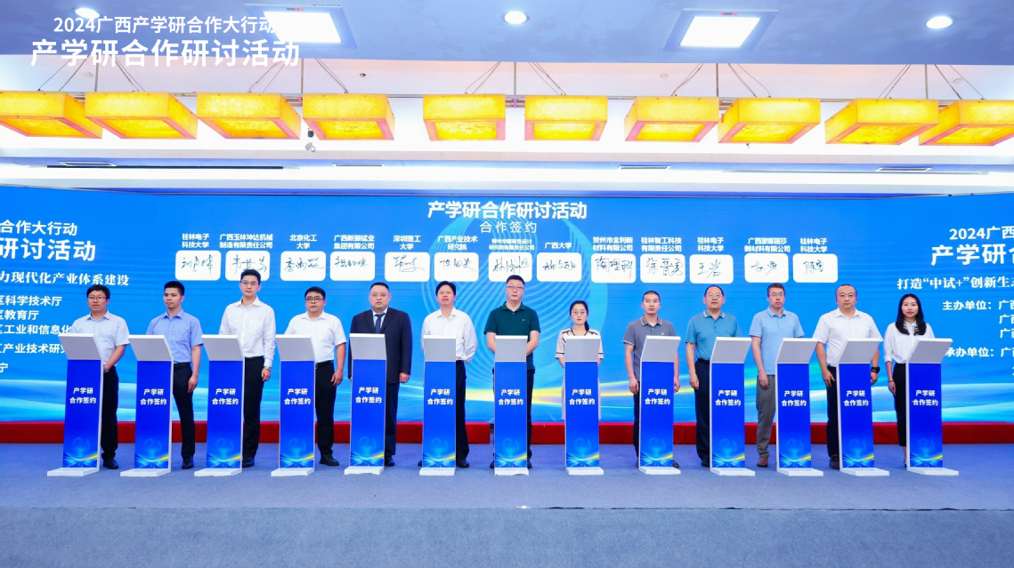 在上午举行的启动仪式活动中,三亿官方官网三亿(中国)_三亿(中国)教授朱归胜与广西煜燊高分子材料有限公司进行了广西科技成果转化中试研究基地服务产业高质量发展重大项目合作现场签约。在下午举行的产学研合作研讨活动中,三亿官方官网三亿(中国)_三亿(中国)教授杨道国作了题为“依托学校建设中试基地,促进科技成果转化和产学研深度融合”的主旨演讲。期间,广西科技成果转化中试研究基地联盟揭牌成立,三亿官方官网三亿(中国)_三亿(中国)广西电子信息材料与器件科技成果转化中试研究基地和广西半导体芯片封装与测试科技成果转化中试研究基地加入该联盟;3家企业与三亿官方官网三亿(中国)_三亿(中国)相关教师代表进行了产学研合作现场签约。