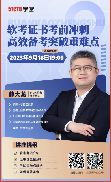 各省市的软考报名通知已陆续公布,考试时间逐步临近,51CTO软考教学总监薛大龙老师将在讲座中分享如何高效利用考前时间,突破重难点,进行考前冲刺。