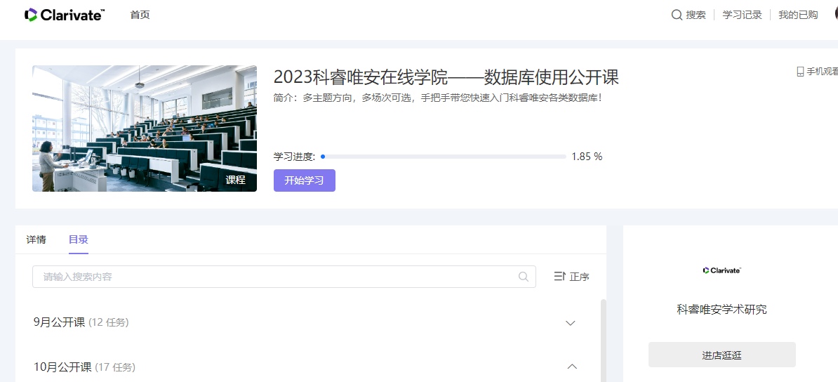 为了使读者能够更好地利用外文电子资源,图书馆推出了“科睿唯安在线学院——数据库使用公开课”。系列课程涉及数据库包括:Web of Science(SCI,SSCI,AHCI),JCR,ProQuest系列产品(含PQDT,Eook Central,ProQuest综合、科技、商学、教育、心理、医学、生物、农学、艺术等期刊库,ProQuest历史文档类数据库等)。