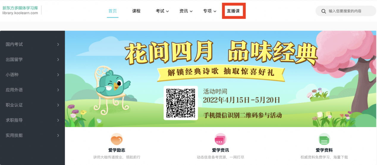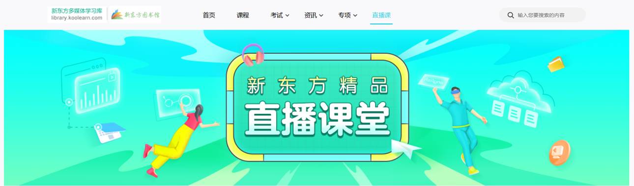 1、馆内访问,登录图书馆新东方多媒体学习库网址:http://library.koolearn.com/,进入主页后,点击上方“直播课”,进入直播频道。