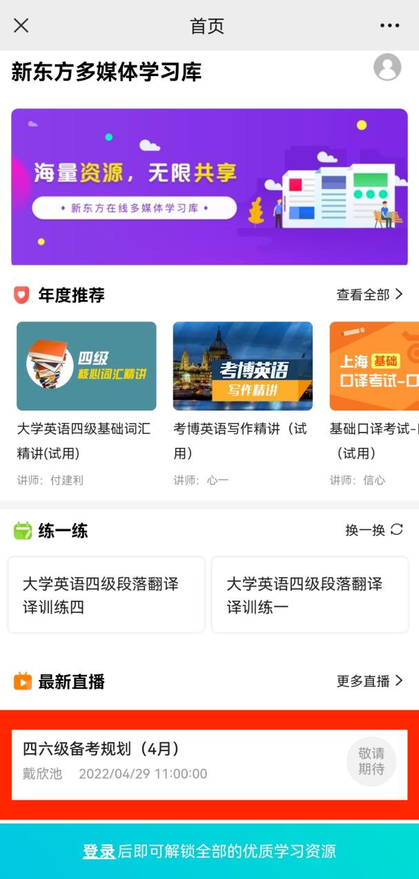 馆外访问,输入新东方多媒体学习库网址:library.koolearn.com,登录个人账号(个人账号需在馆内环境下注册好),点击上方“直播课”,进入直播频道。