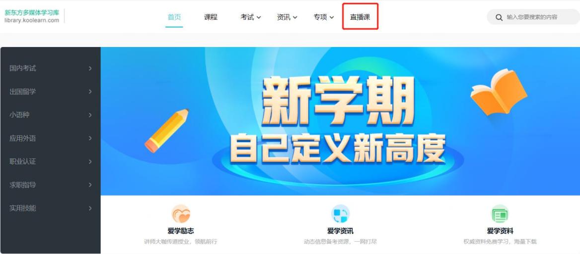 1. 馆内访问,登录图书馆新东方多媒体学习库网址:http://library.koolearn.com/,进入主页后,点击上方“直播课”,进入直播频道。