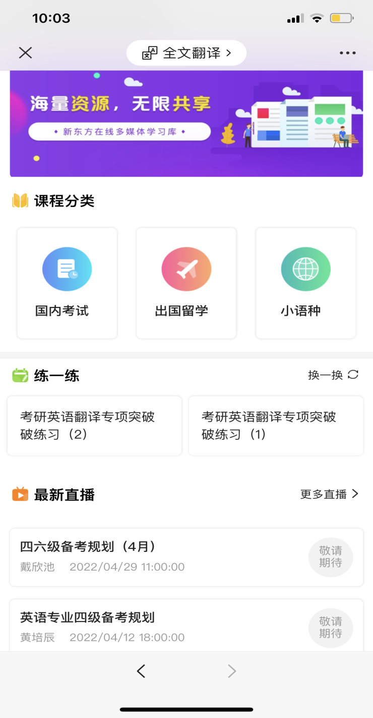 馆外访问,输入新东方多媒体学习库网址:library.koolearn.com,登录个人账号(个人账号需在馆内环境下注册好),点击上方“直播课”,进入直播频道。