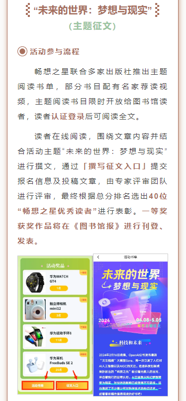 “畅享四‘阅’天。等你来挑战”&“未来的世界:梦想与现实”主题征文活动火热来袭,华为手表,拍立得相机,蓝牙耳机、运动手环等超多好礼等你来拿,还在犹豫什么,赶快熟读全文,扫码参与吧!