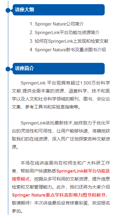 在本次活动中,我们将以丰富多样的形式,引领您探索各类学术资源,全方位助力您的科研成就。关注Springer Nature服务号或订阅话题“春季读书月2024”,随时了解我们推出的学术资源和系列活动。