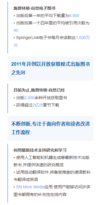 施普林格∙自然拥有30万余种电子图书,涵盖科学、医学、技术和人文社科等学科领域,每年新出版12,000本电子图书,包括学术专著、会议论文集、简报、参考工具书、教科书和系列丛书等。