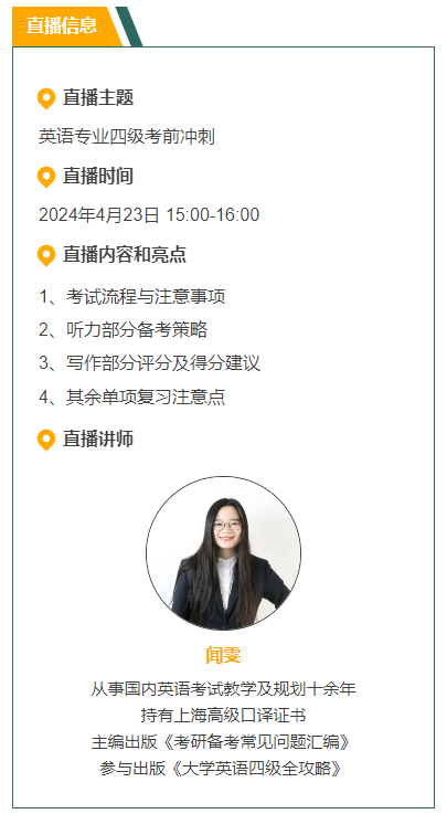 英语专业四级将于6月份考试,相信很多同学都在努力准备考试,本图书馆将联合新东方多媒体学习库举办线上直播分享,特邀新东方老师为大家带来“英语专业四级考前冲刺”主题讲座!