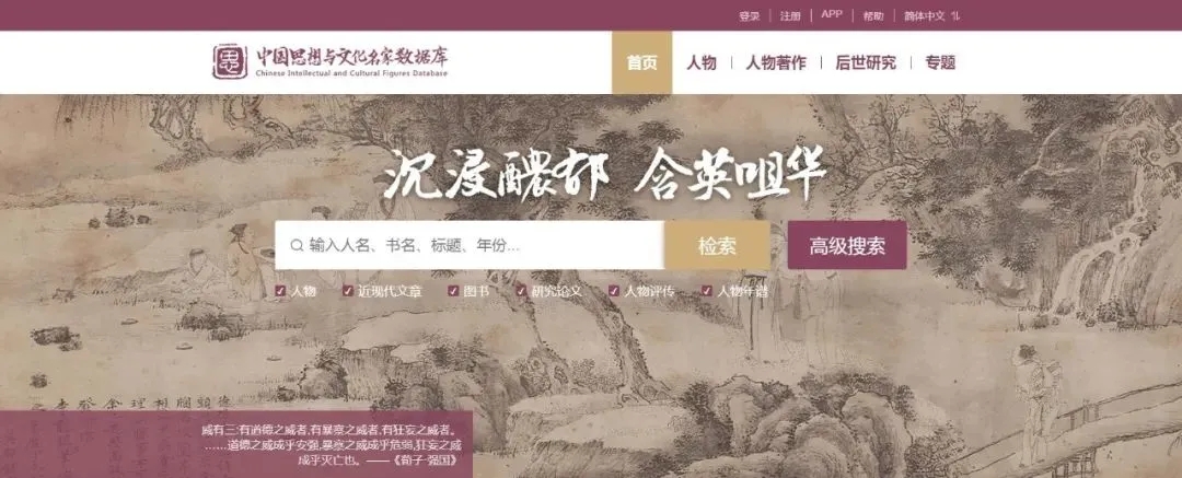 中国思想与文化名家数据库是一个汇聚中国历代经典思想与文化名家生平、观点、著述和年谱的专业知识服务平台。