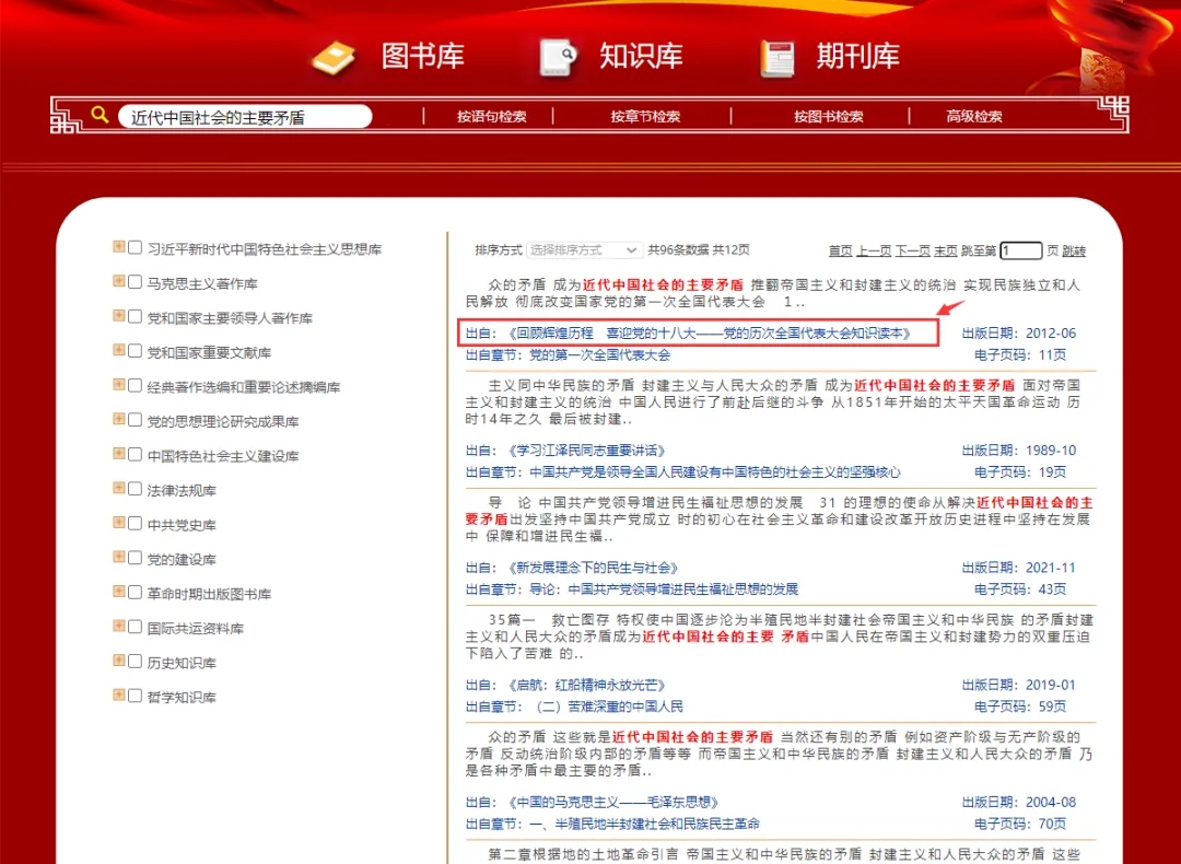第1步:在图书库检索框中输入“近代中国社会的主要矛盾”,如图1。