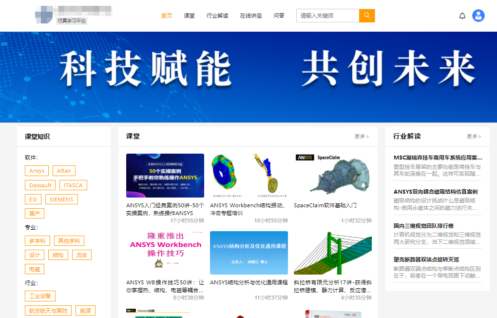 为仿真相关专业的老师、学生提供量身定制的专业学习课程平台,提供学习发展路线引导。通过仿真课程的学习赋能中国企业的仿真应用及高校仿真相关专业,助力仿真驱动国内高端产业研发的进行及仿真行业的普及;同时平台结合行业特点,可以了解相关全国大赛、行业活动、行业在线直播讲座等内容。